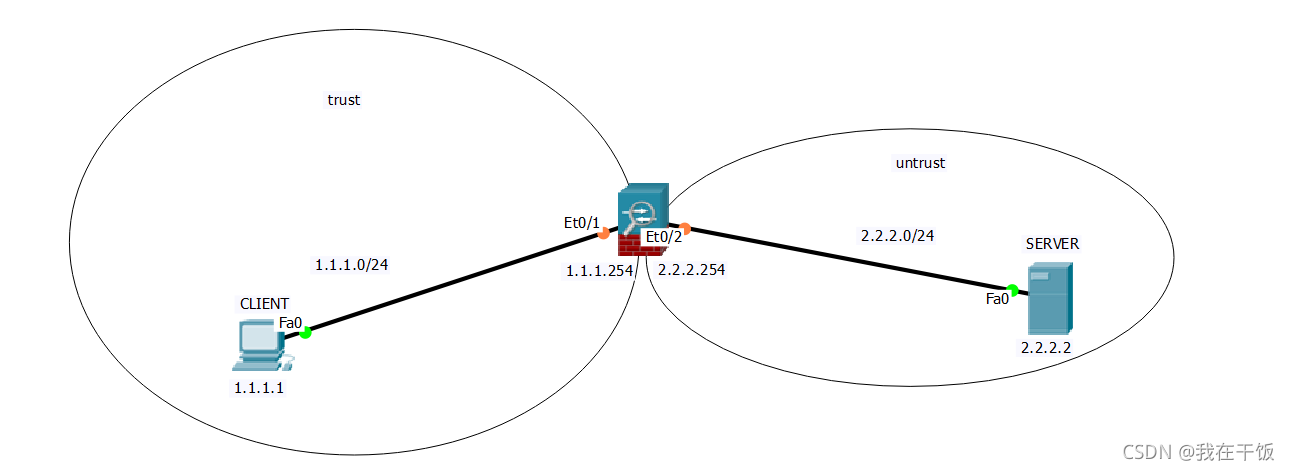 实验要求及目的:配置安全区域,安全规则,实现trust区域中的CLIENT可以ping通untrust区域中的SERVER,SERVER也可以ping通CLIENT ;
