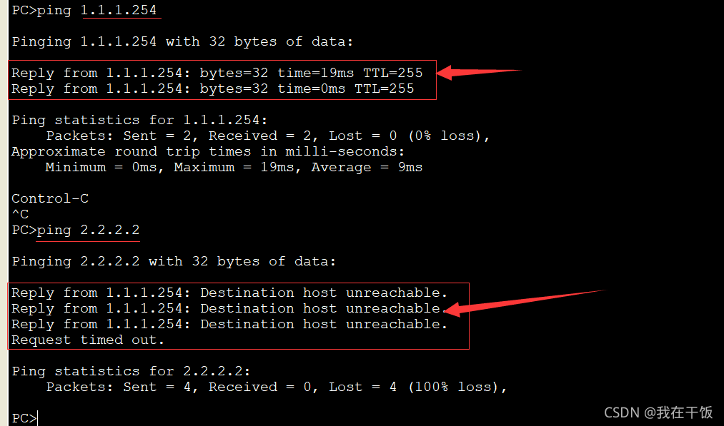 此时,可以在 CLIENT 上ping 1.1.1.254 ,显示可以ping通,则防火墙上的vlan ip 配置生效了,但是ping 2.2.2.2[SERVER]显示目标主机不可达, 因为在防火墙上没有配置安全规则放行流量,[SERVER端也一样]:
